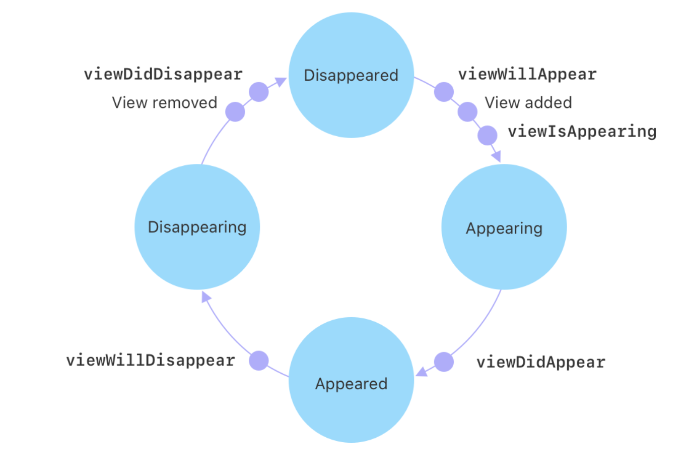 이를 알려면 UIViewController 클래스에 대한 생명 주기를 알아야 하는데, view가 변화하는 4가지 상태(Disappeared, Appearing, Appeared, Disappearing)에 따라서 5가지의 메서드(viewWillAppear, viewIsAppearing, viewDidAppear, viewWillDisappear, viewDidDisappear)가 호출된다.