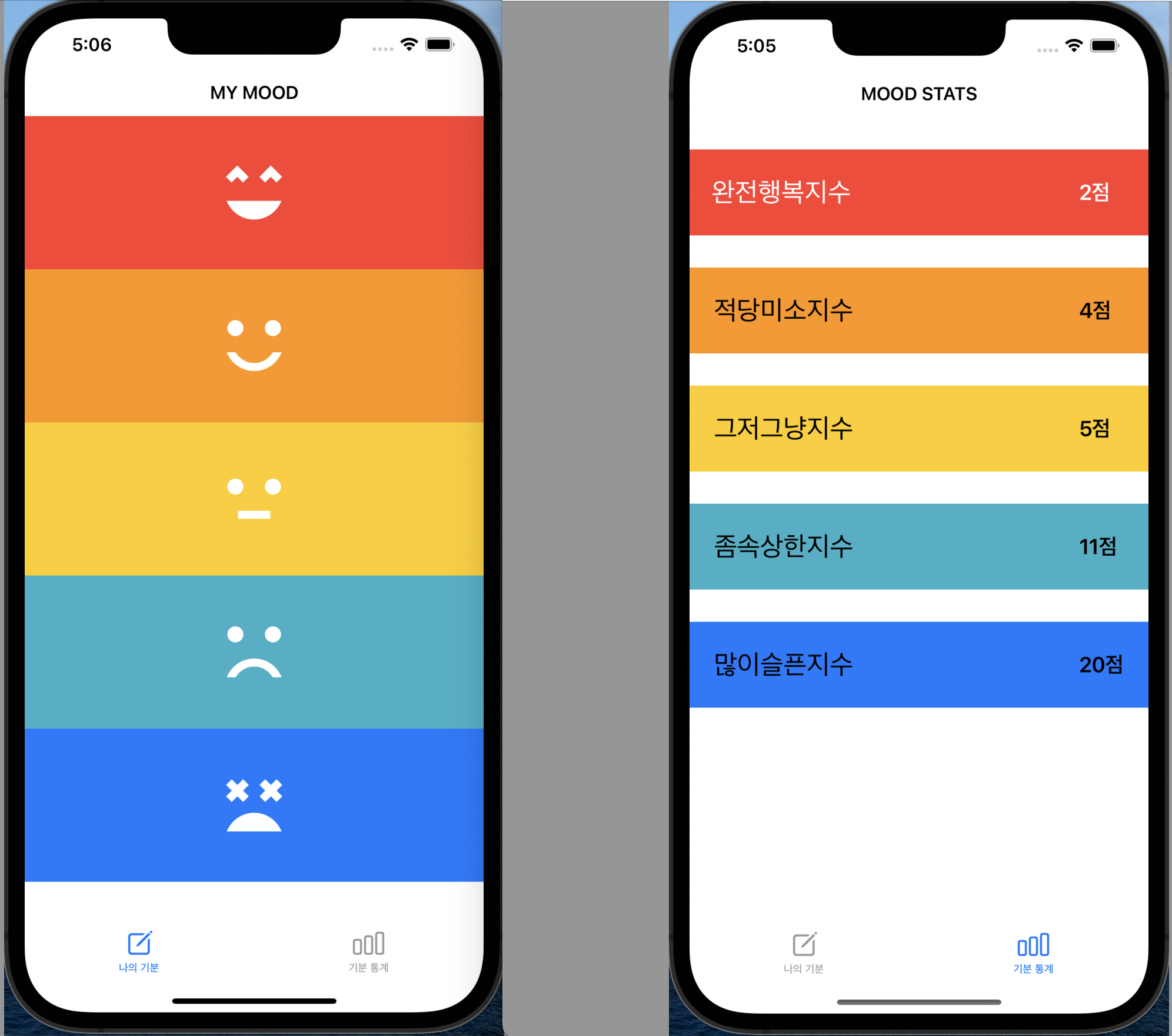 구현한 앱은 "나의 기분"이라는 탭에서 "감정을 나타내는 이모티콘 버튼"을 눌렀을 때, "기본 통계"라는 탭에서 얼마나 눌렀는지를 확인 할 수 있는 앱이다.